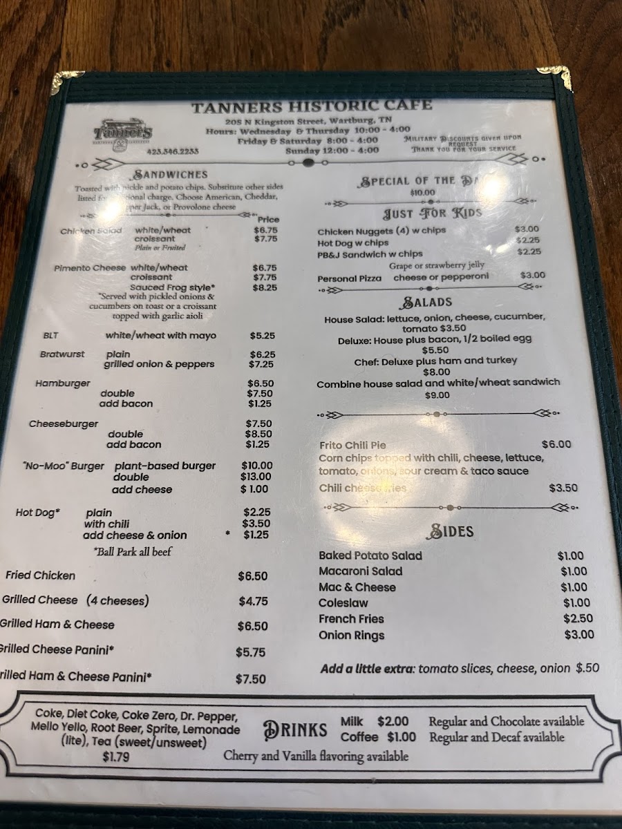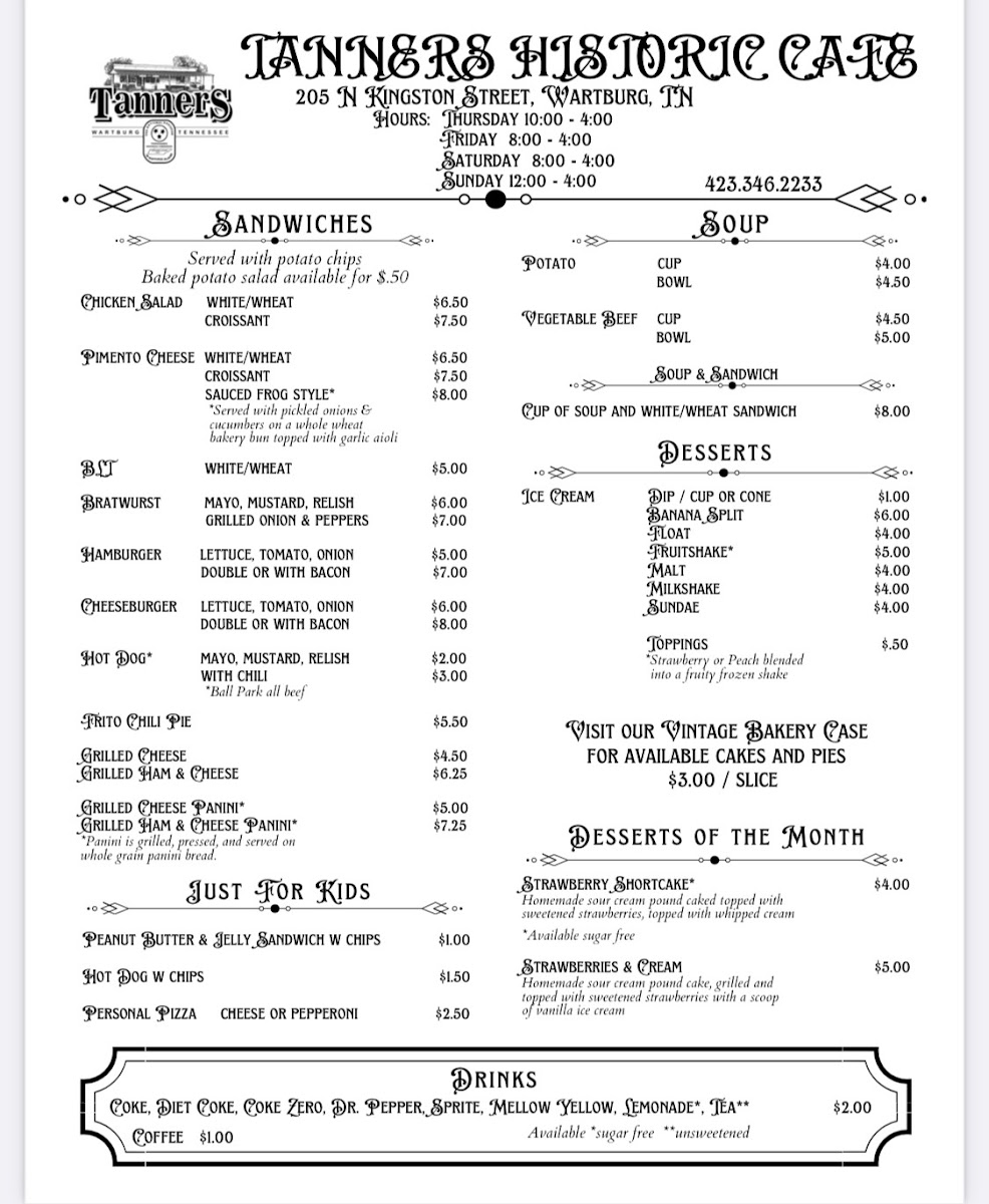 Welcome to Tanners Historic Cafe, a gem nestled in Wartburg, TN, where history meets culinary delight. This charming cafe transports you back in time, boasting an inviting soda shop ambiance. The menu offers a mouthwatering selection that highlights classic American comfort food.